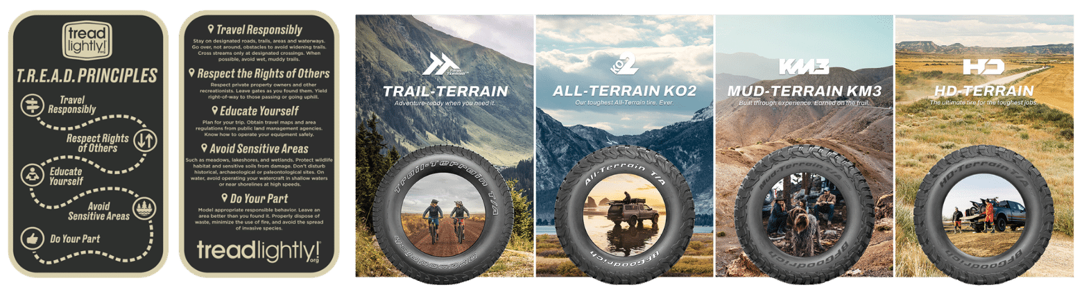 As proud partners and supporter of Tread Lightly!, BFGoodrich Tires asks that everyone be responsible when driving off road and following the Tread Lighty! T.R.E.A.D. Principles. Click here to learn more about BFGoodrich® Tires, including the BFGoodrich Terrain Family of tires.
