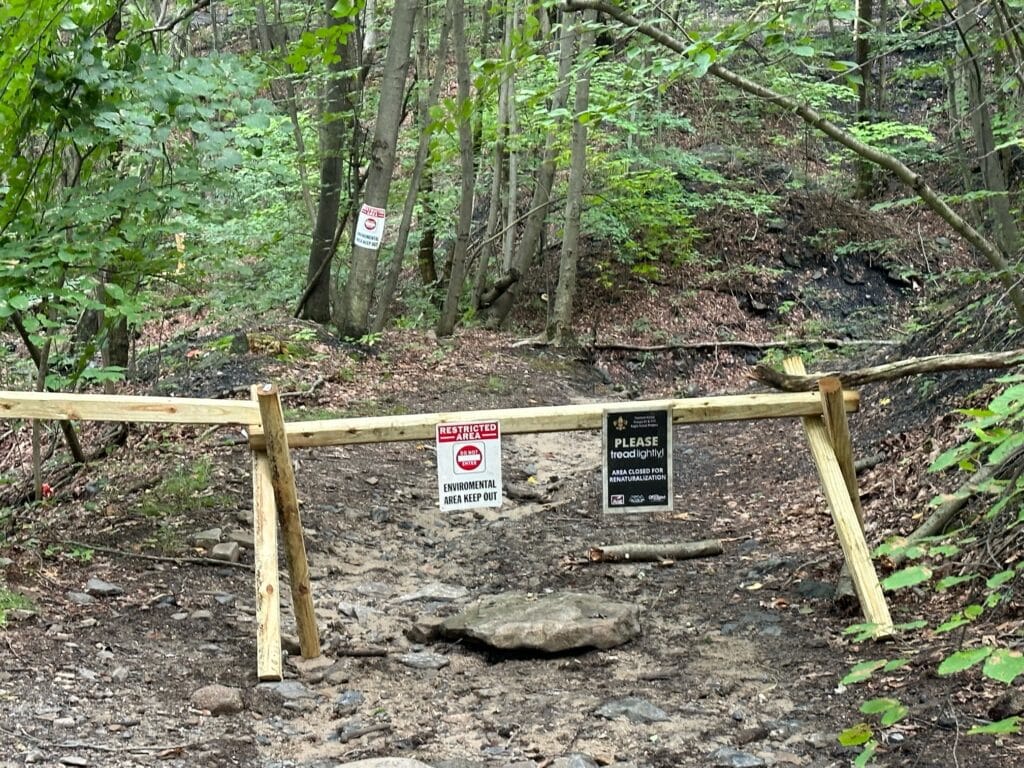 Description: On August 14, 2023, 14 volunteers gathered at the Anthracite Outdoor Adventure Area to support Trenton Kautz’s Eagle Scout project. Trenton and the volunteers worked to protect a mountain stream at the base of the Barney Rubble Trail. They also cleaned up debris and installed educational signage informing trail users about the area being closed for re-naturalization purposes and the sensitive area. Volunteers used 600 linear feet of timber plus deadfall to create trail barriers to block off user created trails. They also removed 750 pounds of dumping debris and trash from the area, including old PVC water pipes used to collect spring water for buildings that no longer exist.
