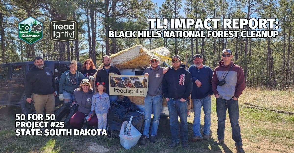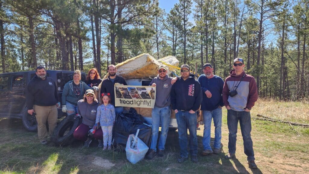 On May 13, ten volunteers from the Black Hills Jeep Club removed 1,500 pounds of trash from the Black Hills National Forest in South Dakota, improving 7 miles of trail. Along with this cleanup, the Quadratec 50/50 Program supported the Black Hills Jeep Club education outreach event in the Black Hills National Forest. This work helped to not only provide a preseason clean-up of popular trails in the Black Hills but also functions as an educational outreach event where the club hosts off-road training, provides OHV stickers and shares the Tread Lightly! Ethic.