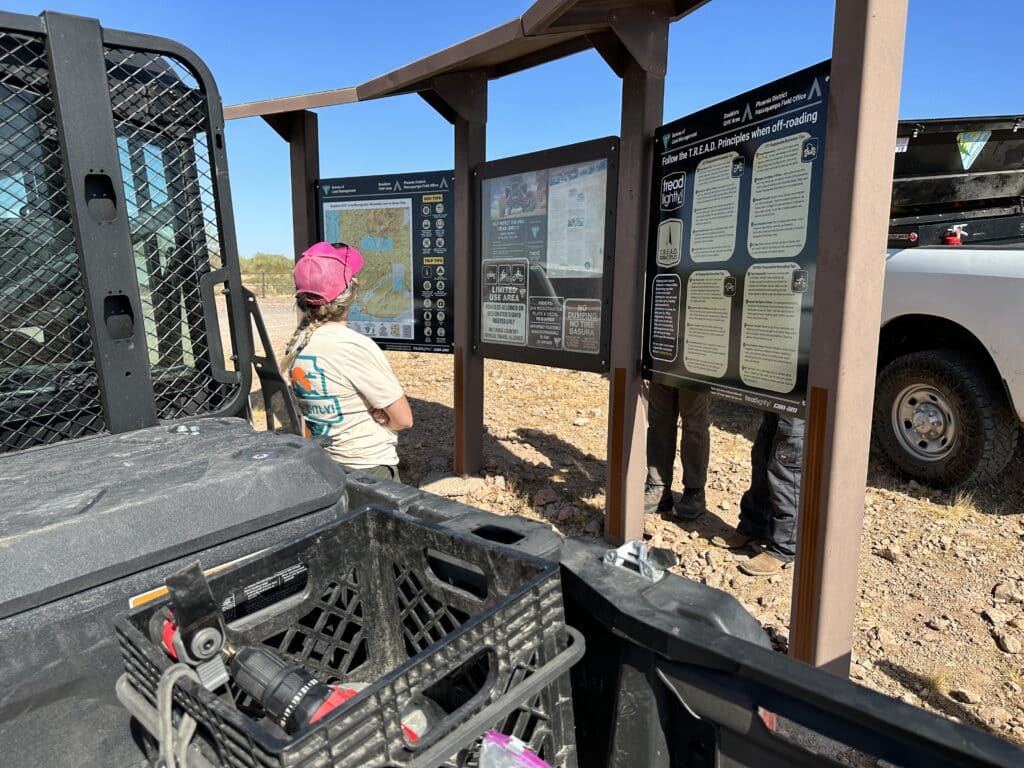 On August 29, 2023 the Tread Lightly! team worked to improve the Boulders OHV area, a popular staging area for the Lake Pleasant/Hieroglyphic Mountain OHV recreation area which showcases a motorized off-highway route system in the scenic Upper Sonoran desert landscape. In total, four signs were updated in different locations to help educate trail riders on responsible use to help protect the area. The signs relayed information about the area’s 14-day camping limit, fire bans and historical location information. In total, five miles of motorized trail were improved.
