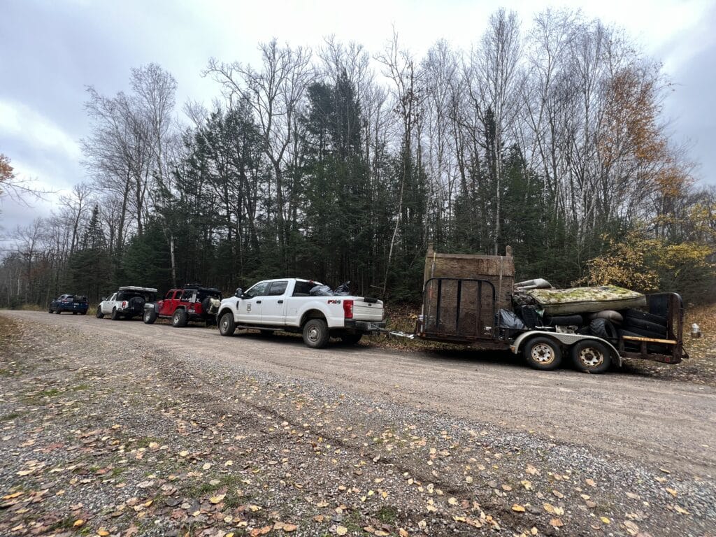 The Tread Lightly! Quadratec 50 for 50 Cleanup in the Chequamegon-Nicolet National Forest, organized with the support of Northology Adventures, Wisconsin Overland, and Wisconsin Jeep Owners Group members, proved to be a significant success in cleaning up several dump sites targeted by National Forest staff. Volunteers gathered at the Laona Ranger Station from across the upper midwest, working diligently to clean up dump sites from Crandon, WI, to Mountain, WI, 45 miles away.