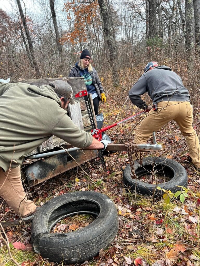 On October 28, 2023, twelve volunteers from Wisconsin, Illinois, and Minnesota dedicated their time and energy to this cleanup effort. Despite the challenging conditions and distance, their commitment shone through, emphasizing the importance of conserving these natural landscapes. These volunteers split into two teams and worked tirelessly from 9 am to 3 pm, accumulating an impressive total of 72 hours of volunteer work. One team rolled an illegal hunting blind out of the deep woods and the other recovered a discarded trailer full of trash. Other trash collected included mattresses, furniture, car and boat parts, an inflatable pool, cans, bottles and general household trash. A 20-yard dumpster was completely filled and over a dozen discarded tires removed from the woods.