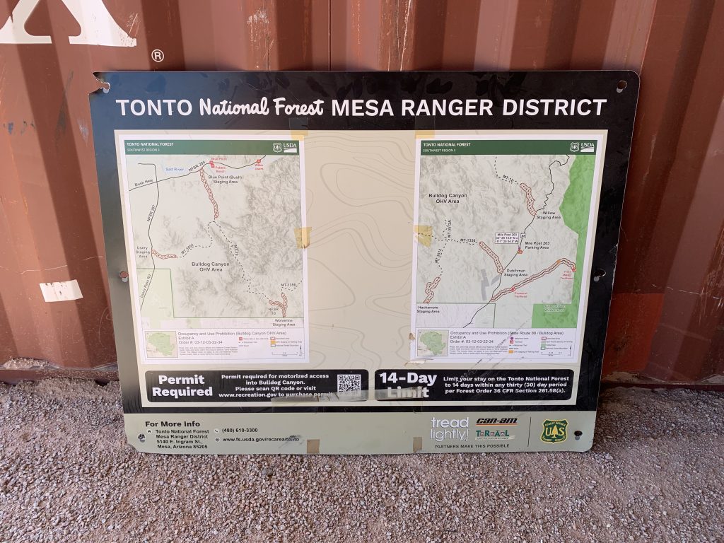 On September 9, 2024, a replacement sign was installed at the Dutchman Staging Area in Bulldog Canyon in the Tonto National Forest. The former sign was heavily damaged and needed to be replaced to help educate off-road riders and other recreationists in the area on the importance of riding responsibly. The signs provided local trail information, maps and educational messaging.