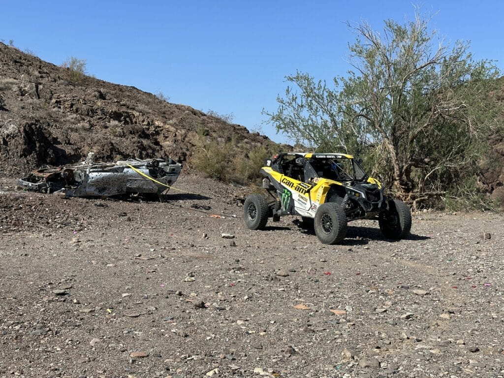 Removing the car was no easy feat. When found, the abandoned Ford Taurus barely resembled a car. It was crunched, shot up and resting on its roof. To remove the vehicle from Bureau of Land Management land, a VIN number was needed to ensure the vehicle was truly abandoned, then documented with Arizona Department of Transportation and called-in to a wrecker. Finding a viable VIN proved to be more difficult because of the state of the vehicle. Sara Price came to the rescue and was able to use her Can-Am to flip the remains of the car over and drag it to an easier pick-up location for the wrecker.