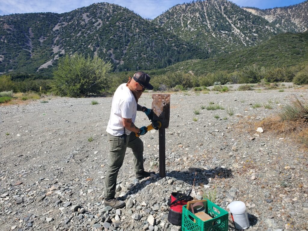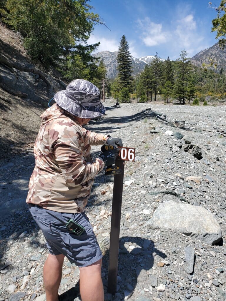 Description: On June 24th, 12 volunteers gathered at the entrance to the Lytle Creek Recreation Area in California ready to do their part. Lytle Creek, like many of California’s public lands, sustained substantial damage from the fierce storms that rolled through the 2022 winter, and one of the yellow post camping sites was still underwater when volunteers got to work. Under Forest Service direction, volunteers set to a variety of tasks, including rehabilitation of bullet-ridden signs, installing Carsonite signage, and winching boulders to close off user-created trails. Along with that hard work, volunteers removed 300 pounds of trash, improving 12 miles of trail in the area.