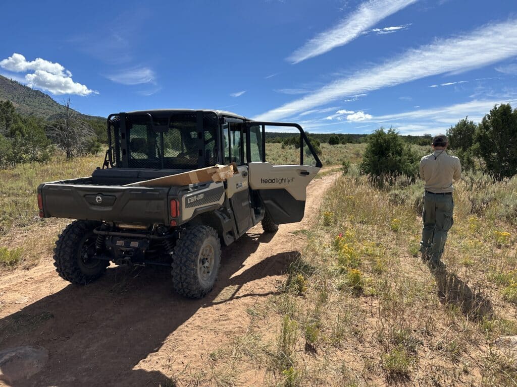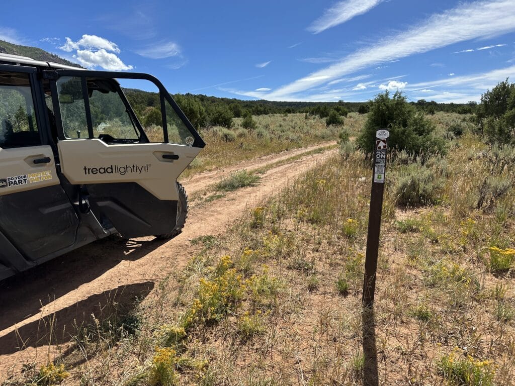 On August 11th, Tread Lightly! staff and the US Forest Service set off to install new carsonites and trail markers on the Rim Rocker trail which travels through the Manti-Lasalle National Forest near Moab, Utah. The work was made easier by the Can-Am Defender Max Limited provide by Can-Am to Tread Lightly! as the Team was able to cover nearly 60 miles on the day.