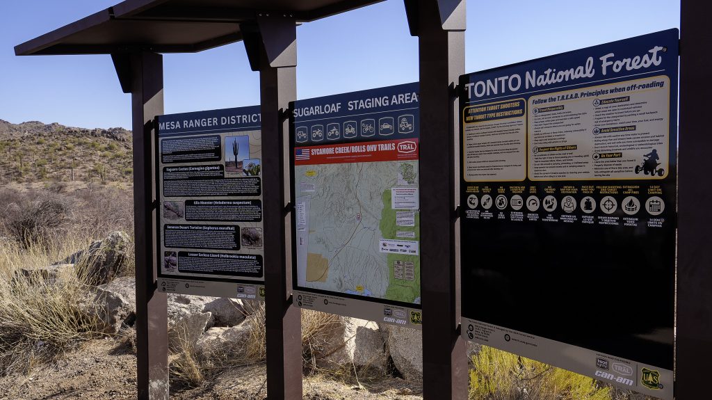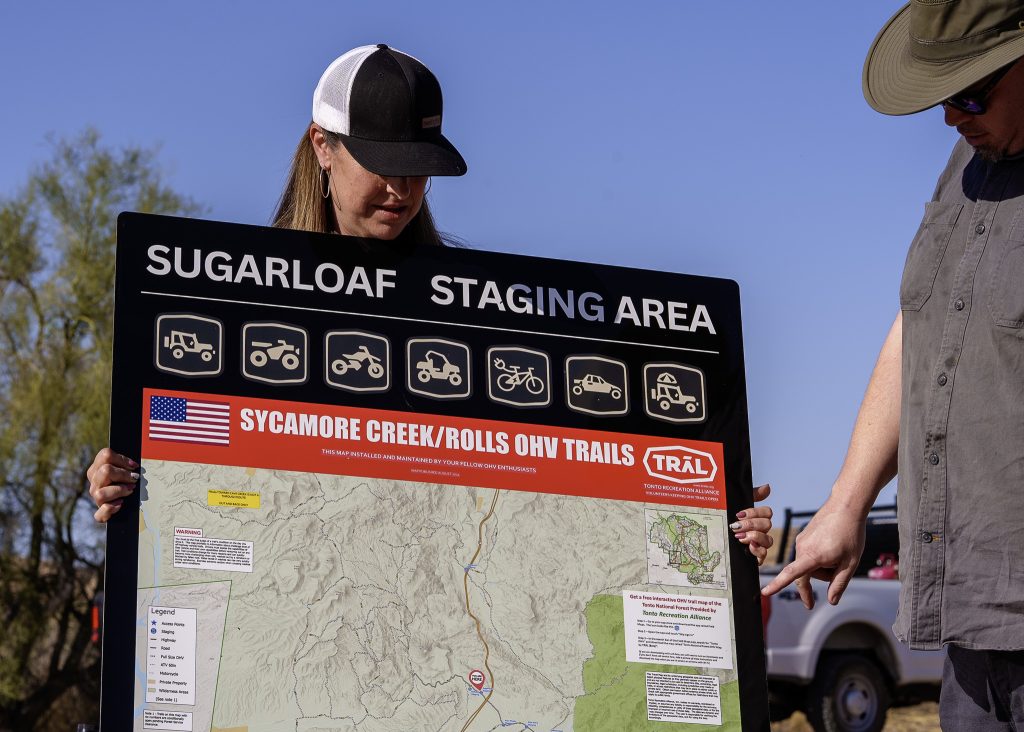 “The Tonto National Forest is very grateful to have such wonderful partners as Tread Lightly! to help support the OHV program and our recreating public. The information kiosk at Sugarloaf Staging Area was a much-needed improvement, and we couldn’t have done it without the help and coordination from Tread Lightly! We also want to thank Tonto Recreation Alliance, Arizona Plasma, and the funding provided by Can-Am that helped make this project possible.”-Kelly Araiza OHV Program Manager