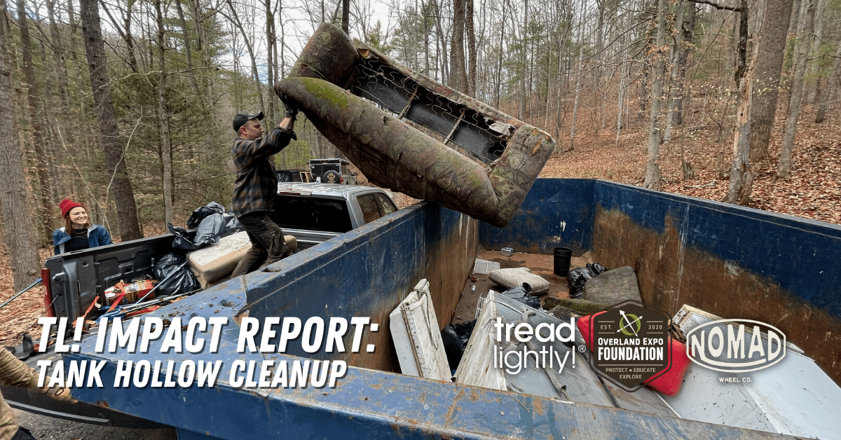 Description: The Tank Hollow Cleanup project is one of four Tread Lightly! stewardship projects funded by the Overland Expo Foundation and Nomad Wheels in conjunction with Overland Expo events. The Overland Expo Foundation is dedicated to creating partnerships with people and organizations that protect and promote the interests of the overlanders, helping provide education and expert resources that enrich the community, and encouraging responsible 4x vehicle- and motorcycle-based exploration of our world.