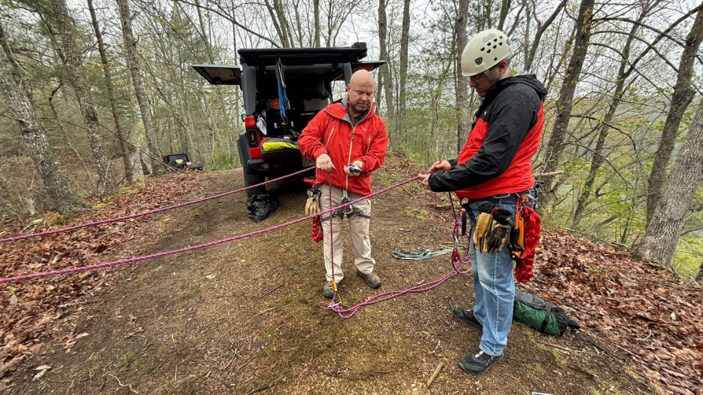 The plan for the team of four volunteers was for two members to rappel down the ravine to be the permanent down-hill riggers. Two remained at the top to operate the equipment and winch lines.