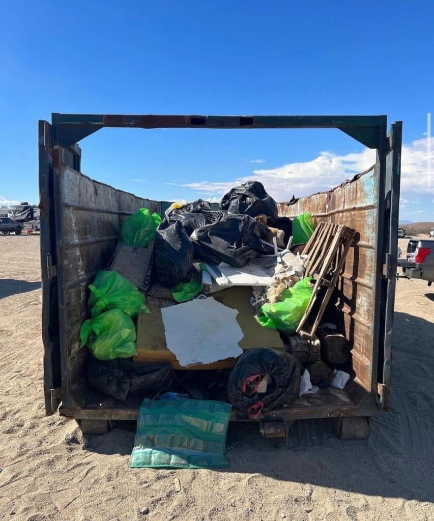 Description: On Saturday, October 8, 2022, nearly 400 volunteers gathered at the Stoddard Valley OHV Area just south of Barstow, CA to make an impact and clean up the desert ahead of the inaugural California 300 race. Over the course of 3.5 hours, the volunteers scoured the desert, collecting trash including tires, wrecked patio furniture, camper shells and more. By the time the work was done, and the day was heating up, nine 40-yard dumpsters were filled with 10.5 tons of trash.