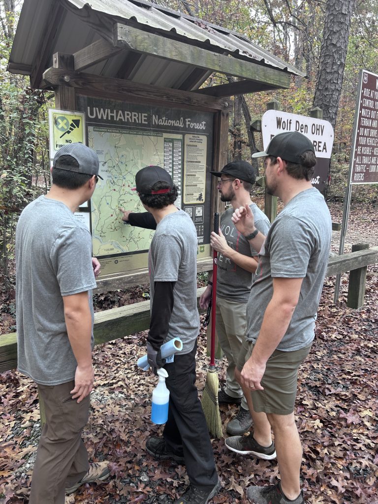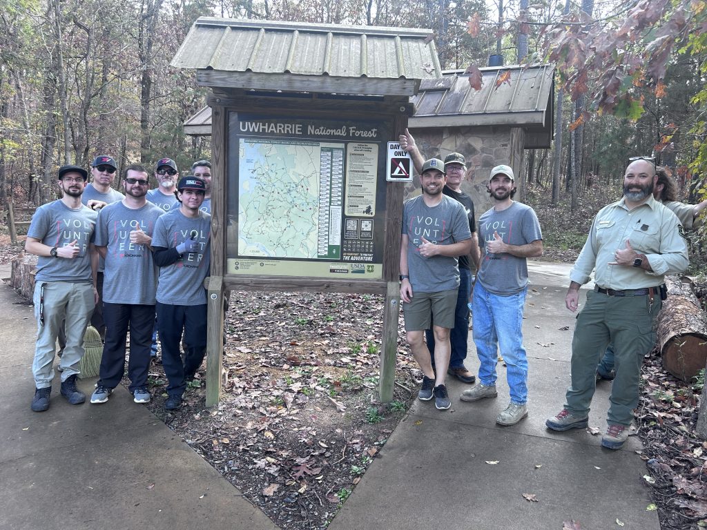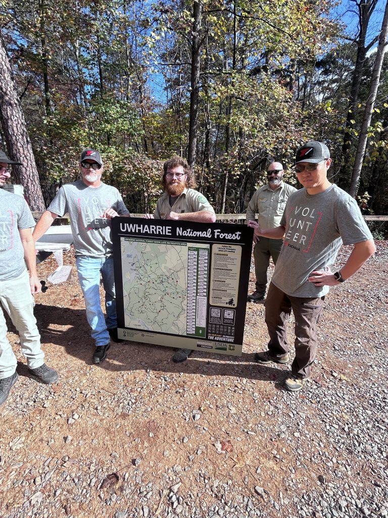 Description: On November 7th, nine volunteers from Yokohama Tire Company joined Tread Lightly! and the Uwharrie National Forest Team to install new educational and responsible recreation signs on seven kiosks on the Badin Lake OHV Trail system.