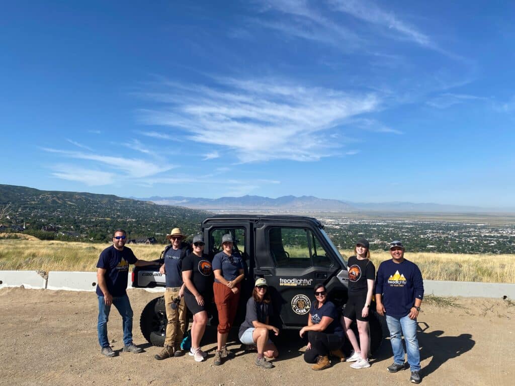 On July 18, 2022, eight Team Members from Tread Lightly! worked to install four new educational kiosk signs at the Ward and Farmington Canyon trailheads. The signs are designed to help educate riders on how to minimize their impact when riding on these trails. This trail system is heavily used due to its proximity to the greater Salt Lake Metropolitan area and is located above the highly visible, Bountiful “B”. Along with the signage installation, the Tread Lightly! Team Members also removed 10 lbs of trash from the trails.