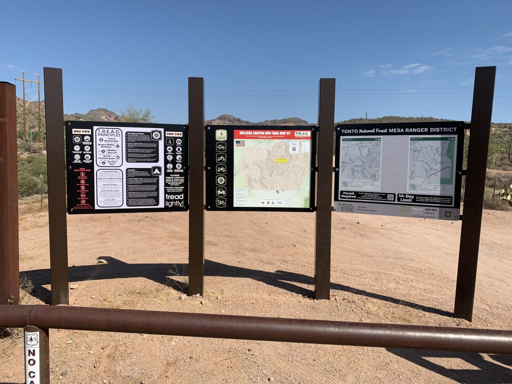 On September 9, 2024, a replacement sign was installed at the Wolverine Staging Area in Bulldog Canyon in the Tonto National Forest. The former sign was heavily damaged and needed to be replaced to help educate off-road riders and other recreationists in the area on the importance of riding responsibly. The signs provided local trail information, maps and educational messaging.